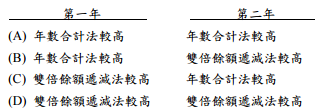 22. 假設某機器於 1 月 1 日取得,耐用年限 4 年,估計殘值為成本的 15%,則採年數合 計法相較於雙倍餘額遞減法所計算之第一年及第二年之折舊費用情形為: