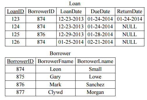 【已刪除】二、以下 Loan 與 Borrower 為兩個關聯資料表。當中 Loan 記錄著每一件貸款資料; Borrower 記錄著每一位借款人資料,BorrowerLname 與 BorrowerFname 分別為借款 人的姓與名字。請寫一 SQL 程式片段,依姓名順序輸出每一位借款人的姓與名字及 其借款次數。 (10 分)