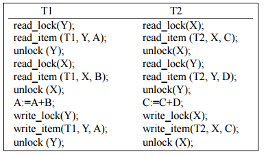 【已刪除】四、以下為在同步處理系統裡,執行交易(transaction)時常被執行的動作: read_item(Ti, A, B):在交易 Ti 中,讀取資料 A 的內容,並將其存入資料 B 中。 write_item(Ti, A, B):在交易 Ti 中,將資料 B 的內容寫入資料 A 中。 read_lock(A):對資料 A 進行鎖定,使其他交易無法對其進行讀取的動作。 write_lock(A):對資料 A 進行鎖定,使其他交易無法對其進行寫入的動作。 unlock (A):解除對資料 A 的鎖定。 設 T1 與 T2 為系統中正在被執行的兩個交易(transaction) ,而 X 與 Y 為 T1 與 T2 中 所共用的兩個變數。T1 與 T2 之程式指令如下所示,並設在執行 T1 與 T2 前,X = 20; Y = 30。請討論在執行完 T1 與 T2 後,變數 X 與 Y 會有何可能結果。 (20 分)