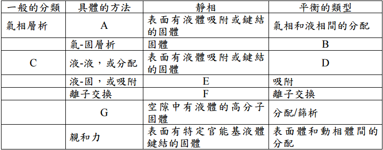 【已刪除】 (一)請就層析法的基本分類、儀器及應用,回答下表中的 A~G 空白欄位。(14 分)