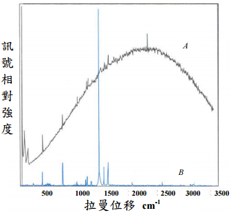 (二)蔥(anthracene)的拉曼光譜圖如下,A 光譜使用氬(Ar)離子雷射光源(514.5 nm)及 分散式拉曼光譜儀,B 光譜使用銣釔鋁石榴石(Nd-YAG)雷射光源(1064 nm)及傅立葉轉換拉曼光譜儀。請比較兩張光譜圖之同異性及原因。(10 分)