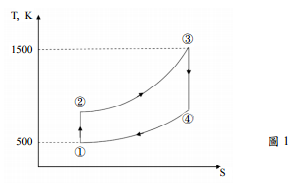 【已刪除】四、TPE 燃氣渦輪機發電站以理想布累登(Brayton)循環(圖 1)進行運作,其壓力比 為 8。已知①與③的焓(enthalpy)值分別為 300 kJ/kg 與 1400 kJ/kg,該循環的返回 工作比(back work ratio)與熱效率(thermal efficiency)則分別為 40%與 45%。請問, ②的焓值為何?(20 分)