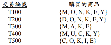【已刪除】一、下列為包含五筆交易之交易資料庫,在購買的商品欄位中,每一個英文字母代表一 種商品,例如編號 T100 的交易購買 M、O、N、K、E、Y 六種商品。