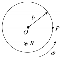 中,以角速度ω旋轉,且有兩固 定電刷分別接在圓盤盤心 O 及盤邊 P 處,若磁通密度