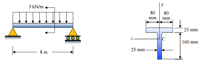 【已刪除】二、如圖所示一 8 公尺長簡支梁承受均佈載重 3 kN/m。T 型斷面如右圖所示。求所受最 大拉應力與壓應力。E=200 GPa。(25 分)