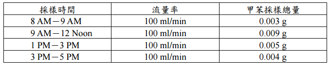 【已刪除】二、環境條件為 30℃,750 mmHg 條件下實施一噴漆作業工人甲苯(C7H8)暴露之空氣 採樣,相關資料如下所示: