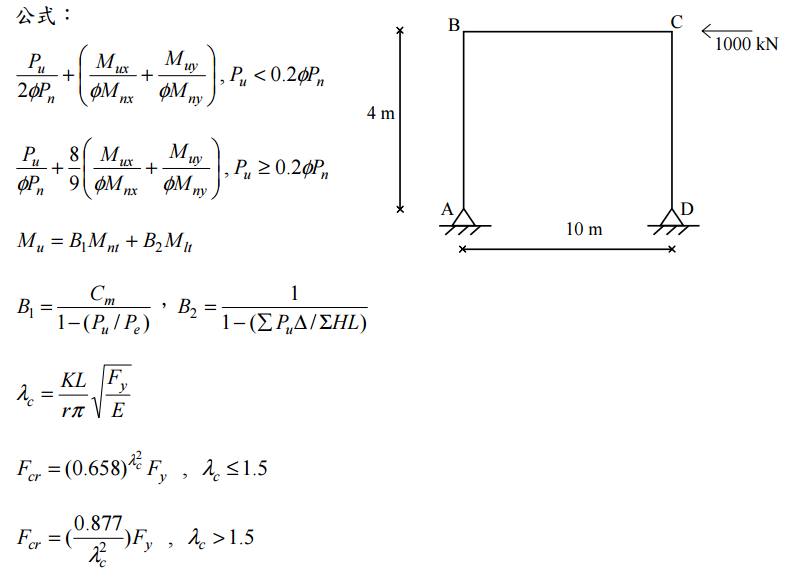 【已刪除】三、門型構架由柱 AB(W40×331 型鋼)、梁 BC(W36×160 型鋼)及柱 CD(W40×331 型鋼)所組成(如下圖所示),其中 A 及 D 節點在受側力方向均為鉸接端 (Pin),B 及 C 節點均為抗彎矩梁柱接頭,構架在受側力 1000 kN 作用下(已含載 重係數),檢核 W36×160(滿足結實斷面,鋼材 ASTM A572 Grade 50)之鋼梁 BC 是否可滿足 AISC‐LRFD 設計要求。假設此鋼梁側向無支撐長度< L