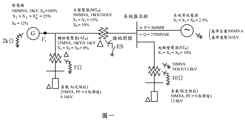 = 95%,兩台升壓變壓器亦相同,其額定容量為 550 MVA,額 定電壓為 20 kV/ 345 kV,電抗 X = 15%,忽略發電機及變壓器繞組之電阻,並忽略 系統阻抗之電阻。正常時無論發電機有無供電,系統匯流排電壓大小均為 345 kV。 當兩部機供電至系統,系統匯流排之有效功率均為 440 MW 時,若系統匯流排發生 三相短路故障,兩部發電機提供至系統匯流排之次暫態故障電流大小分別為 2.5 kA 及 3 kA。試繪出單線圖及系統匯流排發生故障時之次暫態電路模型,模型中電壓、 電流、功率及阻抗等之單位均以標么值(pu)表示(以升壓變壓器額定值為基準 值)。計算正常供電時各部發電機之端電壓大小(kV),及各部發電機供電給系統 匯流排之無效功率(MVAR)。並計算系統匯流排發生三相短路故障時,系統提供 至匯流排之次暫態故障電流大小(kA)。(25 分)