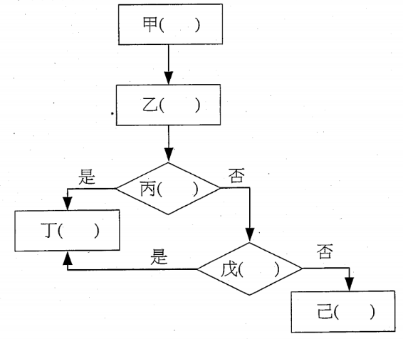 48.下圖是某知名歌唱比賽節自的初選流程圖。假設初選的比賽規則為:演唱歌曲得15分以 上過關,當得分未達15分,若獲得「免死金牌」,仍可過關,否則就遭到淘汰。以下為與 初選活動相關的步驟,請問流程圖上的編號甲〜己,應分別代表什麼步驟? (1)判斷得分 是否大於等於15分(2)判斷是否獲得「免死金牌」(3)參賽者演唱歌曲(4)評審給分(5), 過關(6)淘汰