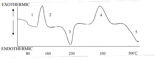 【已刪除】⑵下圖為某高分子樣品在空氣的環境中所測得的 DSC 圖。請指明圖中標示的 1 至 5 特定區間,其最可能發生的物理或化學變化。(圖中的 y 軸向上為放熱方向,向 下為吸熱方向)(10 分)