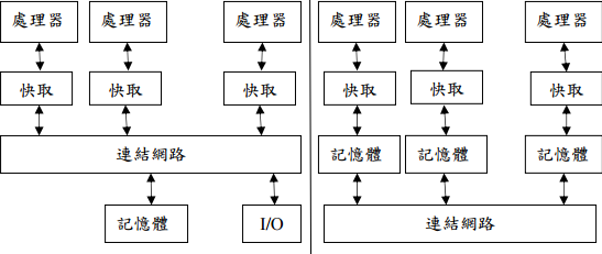【已刪除】二、請就下列左右兩個圖示架構,分別說明是屬於何種多處理器架構?並比較其優缺點。 (10 分)