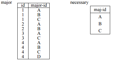 major 關聯表示學生(用 id 表示)修課(用 major-id 表示)情形,necessary 關聯表示必修 課程(用 maj-id 表示),以下查詢:修完所有必修課程 A, B, C 的同學的 id 為: (A)1, 2, 3, 4 (B) 1, 2, 3 (C) 2, 3, 4 (D) 2, 3 (E) 1, 4