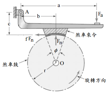 【已刪除】七、下圖為一短煞車皮鼓式煞車系統,已知煞車鼓半徑r=400 mm,a=900 mm,b=360 mm,c=40 mm,煞車來令的摩擦係數f=0.3,煞車扭矩T=300 N-m,求煞車所需的作用力Fa。(20分)