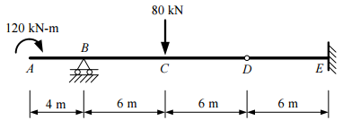 【已刪除】二、如下圖所示之梁結構,B 點為滾支承(Roller support),E 點為固定支承(Fixed support),梁中 D 點為鉸接點,假設全梁撓曲剛度均為 EI。試求圖示載重下,鉸接 D 點垂直變位以及其左側與右側之轉角(斜率)。(25 分)