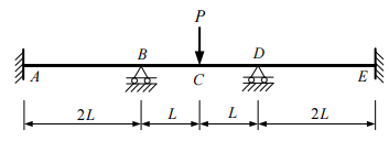 【已刪除】三、如下圖所示之連續梁,A 點與 E 點為固定支承(Fixed support),B 點與 D 點為滾支 承(Roller support),假設全梁撓曲剛度均為 EI。試求圖示載重下,支承 A 與支承 E 所有反力,並繪製連續梁之變形圖。(25 分)