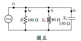 【已刪除】七、如圖五所示,VS = 120 sin(377t) V 之交流電,試求其電路中各支路電流 iR、iL 及 iC 值(請以瞬間方程式表示)。(10 分)