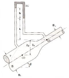 【已刪除】二、有一向右上方輸送水之漸縮管,如圖所示。水之流量為 Q。點(1)及點(2)之管壁間裝 置有倒 U 型管壓計,內有比重小於水之液體,此液體之比重為 SG。點(1)流至點(2) 之次要損失為(K