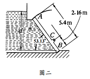 【已刪除】二、一矩形自動閥門如圖二所示,其閥門長 5.4 m、寬 3.6 m,閥門 AB 可繞 C 點旋轉, 試求使閥門自動打開之最低水位 d 為何?(25 分)