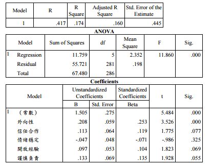 【已刪除】五、某研究者想探究教師人格特質與其工作滿意度的關係,其利用迴歸分析,得下列表 單,該研究者使用何種迴歸方法?(3 分)請你整理下列表單,並說明各人格特質與 工作滿意度的關係為何?(17 分)