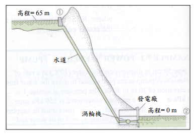 【已刪除】四、在一個小型水力發電廠(見下圖) 最高發電效率下 需要通過高程落差 65 m 以 15.0 m