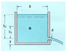 【已刪除】四、有一射流由圓筒側射出,如圖所示。射流直徑 d = 1.00 cm,圓筒直徑 D = 10.0 cm。 射流出口中心之高度為 y。假設射流流速為2√gh m/s,g 為重力加速度,h 為水深。 試求水位由 h