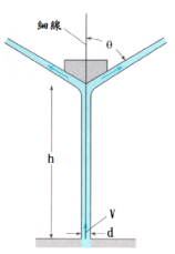 【已刪除】三、由地面垂直向上之水柱,撞上一圓錐物後,被轉向 θ = 60.0°射出,如圖所示。圓錐物重 60.0 N,其中心套在一細線上,故可在垂直方向自由滑動。水柱在地面之直徑 為 d = 3.00 cm,流速 V =15.0 m/s。試求達到平衡時,圓錐物距地面之高度 h 為何? 計算時,可不必考慮摩擦及細線之影響。(20 分)