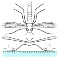 【已刪除】一、某水蟲由表面張力支撐,立於水面,如圖所示。水蟲有六隻腳,每隻腳有L = 5.00 mm 與水面接觸。試求水蟲不會沉入水中的最大質量為何(以 g 表示)?表面張力為73.4 * 10-