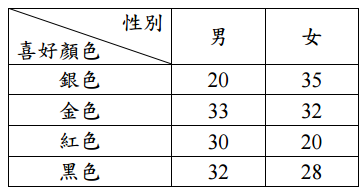 請以顯著水準α = 0.05,檢定汽車顏色喜好和性別是否有關聯?(15 分)
