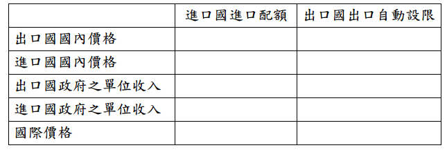 【已刪除】二、假設兩大國(例如中國及美國)分別是 X 產品(例如紡織品)之出口及進口國,其 函數分別為: P = Q 及 P = 80 − Q ,假設進口配額及出口自動設限之數量均為 30,請 將下表繪製於試卷上,並在計算之後將答案填入空格之中,最後判斷那一種貿易障 礙對進口國較有利?為什麼?(26 分)