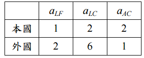 表示生產一單位 Y 產品所需之 X 投入之數量,兩國之生產技術如下:
