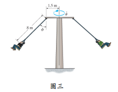 【已刪除】三、如圖三所示之旋轉遊樂設施以固定角速度 θ& 繞垂直軸旋轉,假設纜繩重量與遊客體 積可忽略,若要維持角度φ =45°,則角速度θ& 應為多少?(20 分)