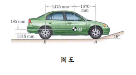 【已刪除】五、如圖五所示之汽車質量 1600 kg,其重心位於圖中所示之 G 點,當前輪剛以等速爬 上 16°之斜坡,且此汽車為後輪傳動(rear-wheel drive),試繪出此時汽車之受力自 由體圖(free-body diagram)並求出在 B 處所需之最小靜摩擦係數(coefficient of static friction)為多少?(重力加速度為 9.81 m/s2)(20 分)