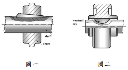 二、⑴敘述圖一裡「斜鍵(taper key)」及圖二裡「半圓鍵(woodruff key)」的特點及 用途。(10 分)