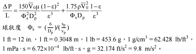 ,黏度(viscosity)為 0.018 mPa · s。顆粒之球狀度(sphericity)Φs為 0.7, 密度為 4.1 g/cm3 。請計算顆粒之平均直徑及單位質量之表面積。(20 分) 尤根方程式(Ergun equation):
