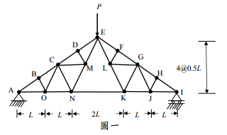 【已刪除】一、如圖一所示桁架,垂直載重 P 於 E 點,各桿件截面積 A、彈性係數 E。利用單位力 法求解 N 與 K 點垂直位移。(20 分)(註:本題若使用其他方法,整題以零分計。)