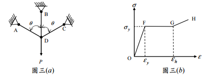 【已刪除】三、如圖三(a)所示桁架,各桿件長 L,桿件 AD 與 CD 之截面積 A,桿件 BD 之截面積 A / 3,∠ADB =∠BDC = θ = 60°。各桿件之應力-應變關係如圖三(b)所示,OF 與 GH 之斜率分別為 E 與 E'(且 E'/E = 0.2),ε