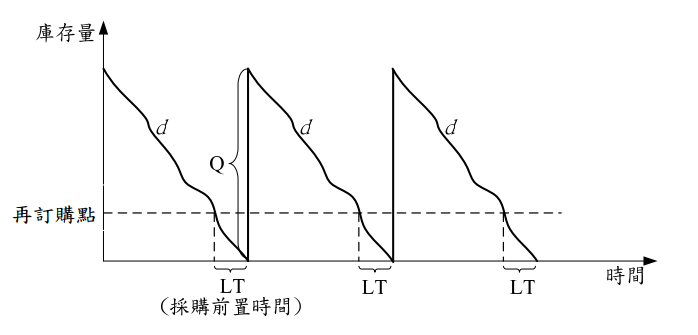 【已刪除】一、下列為一典型存貨模型。請列出再訂購點(Re-Order Point)與「安全庫存(Safety Stock)」之關係方程式,(5 分)並於圖上標示安全庫存(在作答試卷上重畫此存貨 模型,再加標示安全庫存線)。(4 分)請解釋決定再訂購點有那些因素?(8 分)另 請解釋存貨管制實務上有所謂雙箱系統(Two-Bin system)之運作方式,來詮釋此圖 意義。(8 分)