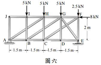 【已刪除】三、構件在受張力或壓力的情況下,試計算圖六桁架 IH、AH 和 BC 構件所受之力。 (20 分)