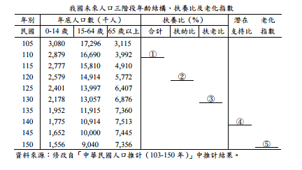 【已刪除】四、請依據下表回答五個標示欄位之數據,(10 分)並且引用表中可算得之各項數據,分 別說明我國未來年少、工作及年老等三階段的人口推計意涵。(15 分)