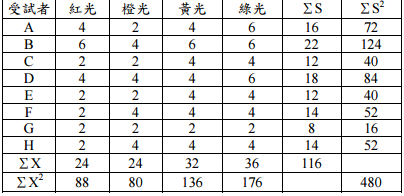【已刪除】三、下表為 8 名受試者在四種色光的反應時間,試問受試者在四種色光的反應時間是否 有所不同?(F.
