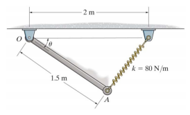 【已刪除】三、如圖所示之 30 kg 均質桿件(OA)當θ = 0°時為靜止,且此時彈簧為自由長度。若彈 簧之彈簧常數為 80 N/m,且其重量不計,試求桿件從釋放後,當
