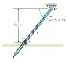 【已刪除】二、如圖所示之 2 kg 質量圓柱體 C 由一銷 P 導引在 OA 桿內之長形槽滑動,且圓柱 C 亦 在水平面上滑動。假設所有接觸皆為平滑(smooth)無摩擦,且 OA 桿之角速度θ&固 定為 0.5 rad/s,試求當 OA 桿角度θ 為 60°時,銷 P 上之作用力。(20 分)