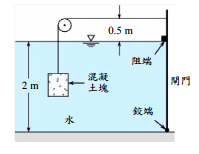 【已刪除】一、如下圖,試求使閘門維持關閉狀態所需的混凝土塊最小體積,假設混凝土塊單位重 量為 23.6 kN/m