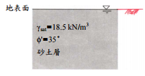 【已刪除】三、下圖所示為無限延伸之水平砂土層,地下水位剛好在地表面。試估算側向土壓力係 數及地表面下 1 m、3 m 與 5 m 深度處之垂直有效應力與側向土壓力。(25 分)