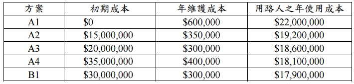 【已刪除】四、以下為某段鄉鎮道路之改善計畫方案,其中 A1 方案為目前狀況(亦即原案 do- nothing),假設利率為 7%,方案壽命皆為 30 年。