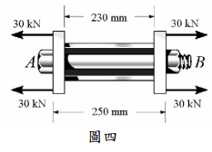 【已刪除】四、如圖四裝置含有直徑為 25 mm 的螺栓在一個套筒(sleeve)內,用兩塊板(其介於 螺栓與套筒間)鎖緊在一起,螺栓長度為 250 mm。該套筒的內徑為 45 mm,外徑 為 55 mm,套筒長度為 230 mm。螺栓與套筒的彈性模數(modulus of elasticity)皆 為 200 GPa。當此裝置承受 60 kN 的總拉力時,試問作用在套筒與螺栓的平均拉力 各為若干 kN?(20 分)
