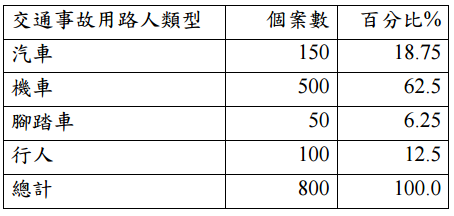 【已刪除】四、某法醫統計交通事故死亡個案,依照用路人類型分類得出百分比(如下表),結論 機車死亡風險最高,請問您有什麼評論?(20 分)