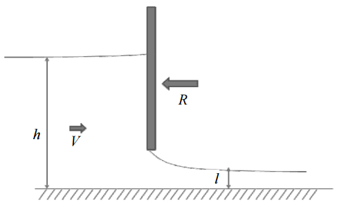 【已刪除】二、由閘門控制明渠水流如下圖所示,若閘門上游水深 h、流速 V、下游水深為 l,欲支 撐閘門,試求閘門每單位寬度之力 R,請以p、g、h、l 表示之。(20 分)