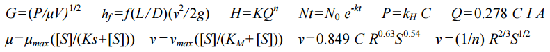 【已刪除】三、給水與污水工程規劃設計之常見公式或相關定律,包含 Chick’s law、Darcy-Weisbach formula、Michaelis-Menten equation、Monod equation、Hazen-Williams formula、 Hardy-Cross method formula 、 Henry’s law 、 Manning formula 、 Rational method formula 與 velocity gradient,方程式如下所示(未照次序):