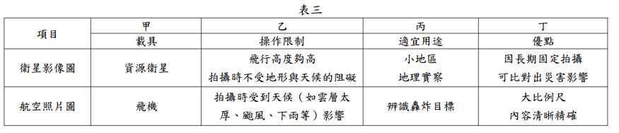 39.表三是航空照片圖與衛星影像圖差異的比較表,表中哪兩項敘述是正確的?